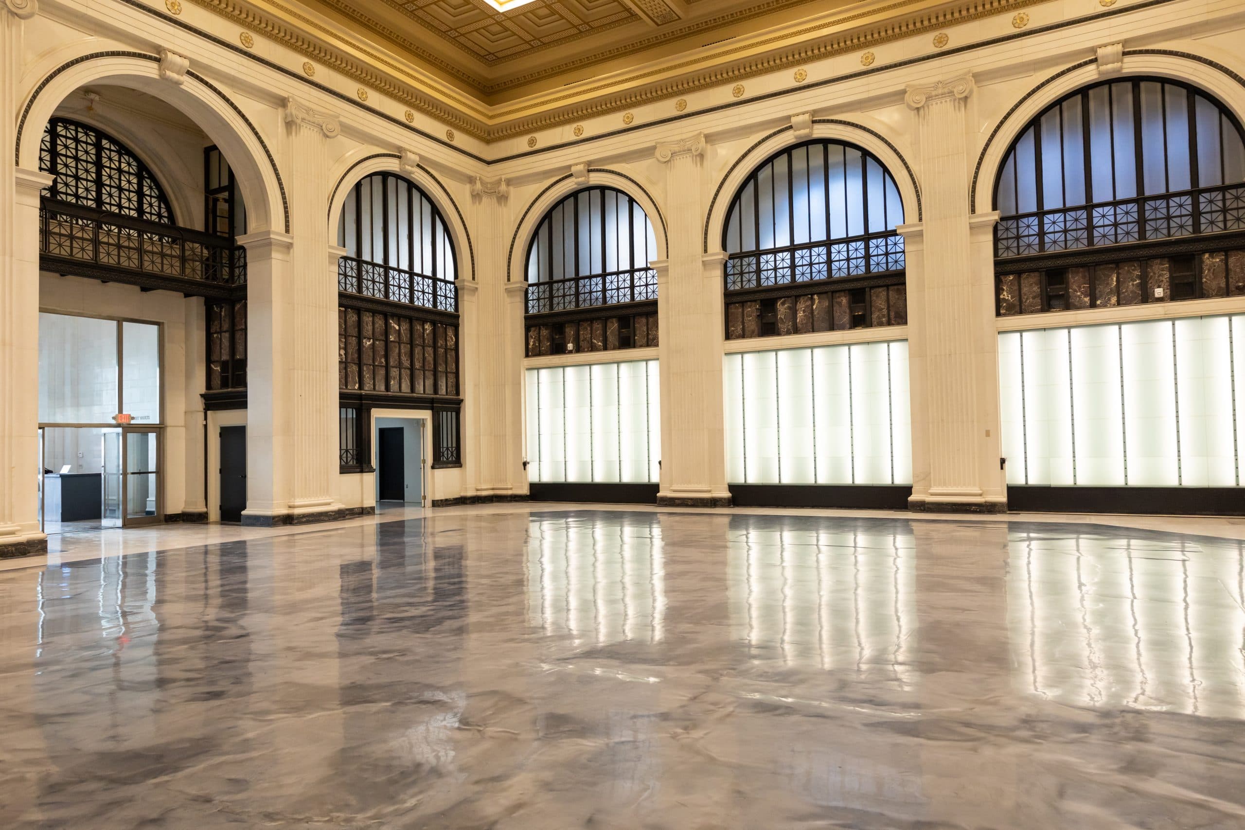 The front section of the space can accommodate up to 130 guests for a seated event and up to 250 guests for a strolling reception. The back section of the space can accommodate up to 500 guests for a seated event and up to 600 guests for a strolling reception.
