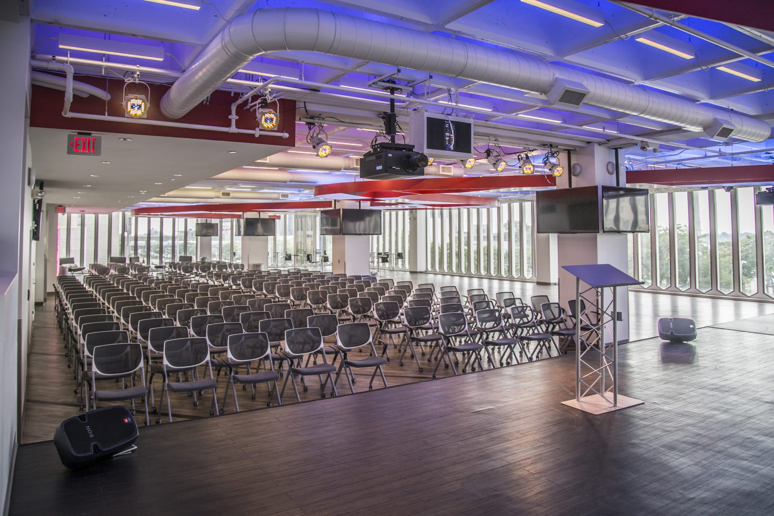 This versatile space, featuring a built-in stage and customizable lighting system, easily transforms to accommodate a wide variety of events.